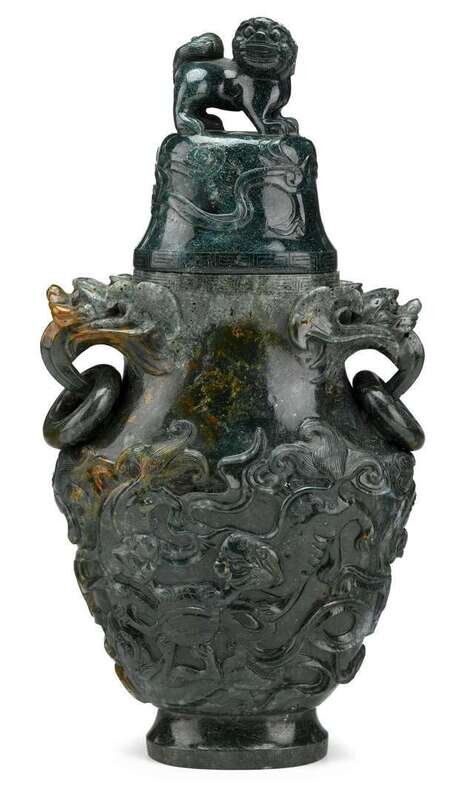 Flattened form, the body carved to show fu dogs in relief with figural ring-drop handles.