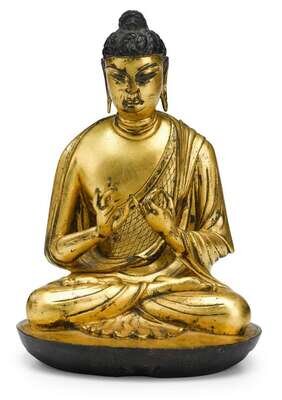 The figure seated in the lotus posture, the hands raised in a spiritual gesture or mudra.