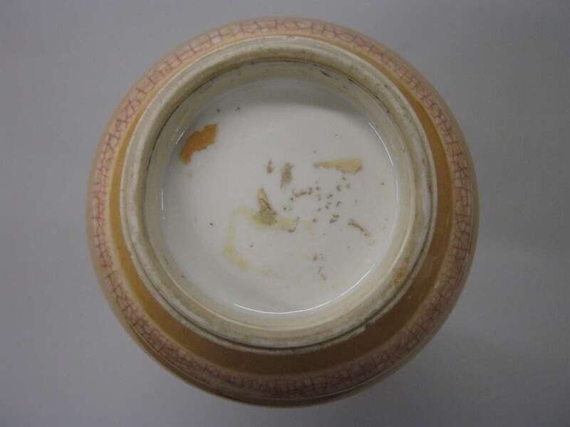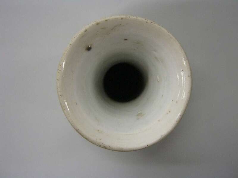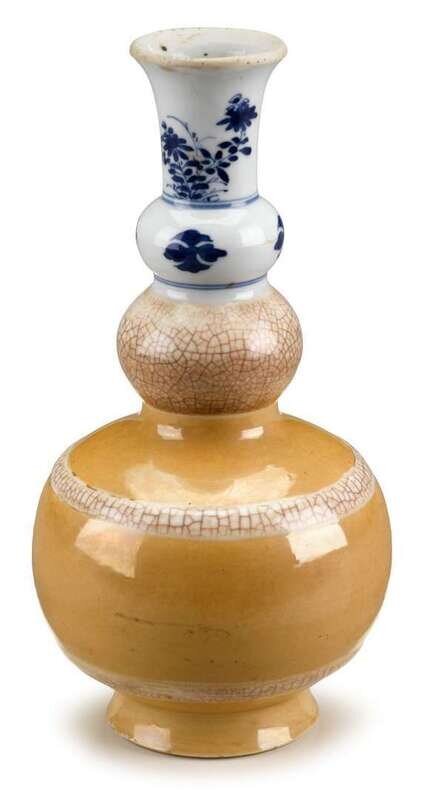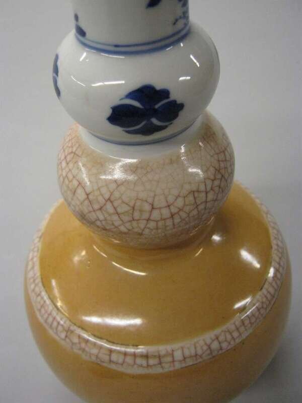 The small vase with three globular sections and a trumpet neck decorated with cafe-au-lait glaze to base and alternating craquelure bands, below underglaze cobalt flowers at white neck.