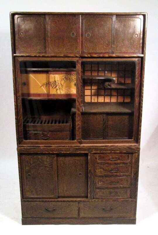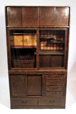 In two sections, the rectangular top over two pairs of sliding doors, above two glazed sliding doors opening to further compartments and shelves, the lower section with two sliding doors beside four short drawers, above two further drawers.
