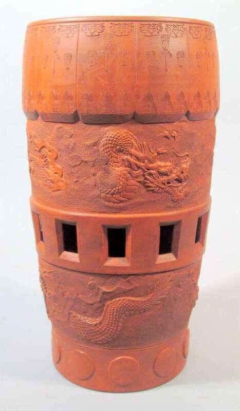 Of cylindrical form tapering slightly to base, depicting dragons coiling around the body with impressed designs to seat.