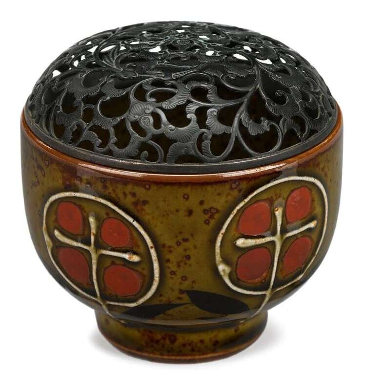 The open-work Indian lotus silver cover surmounts a conforming U-shaped base enameled to show two cartouches on brown ground, raised on small foot.