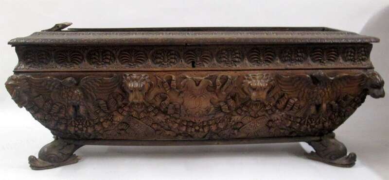 Sarcophagus form, carved to show eagles, lion's masks, and foliage, raised on dolphin-form feet.