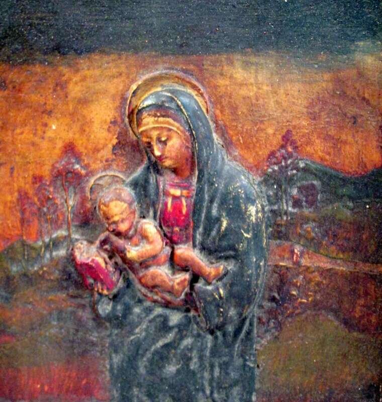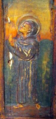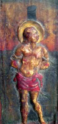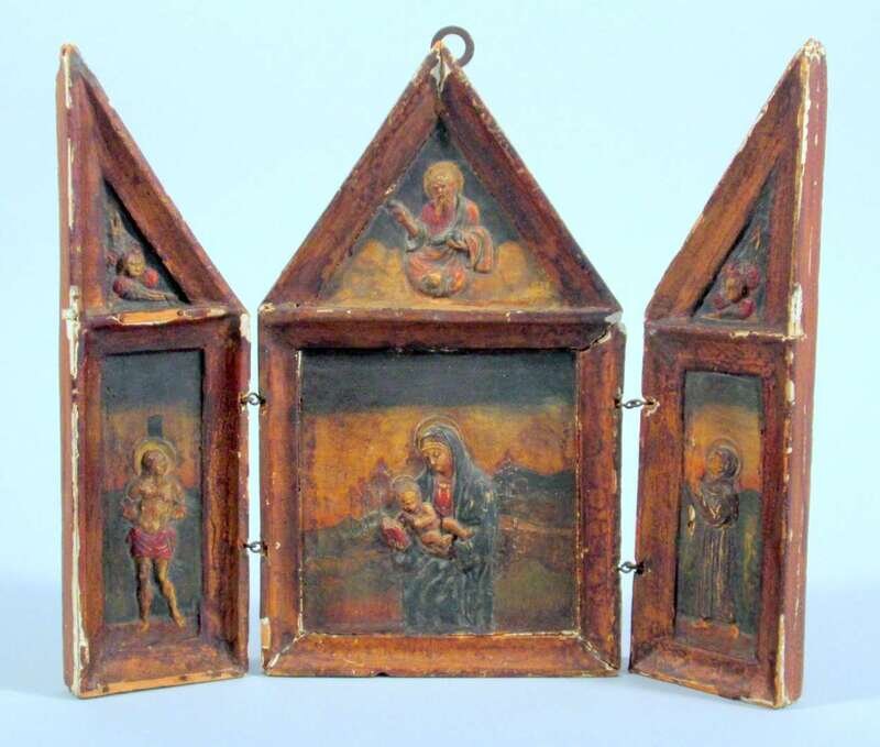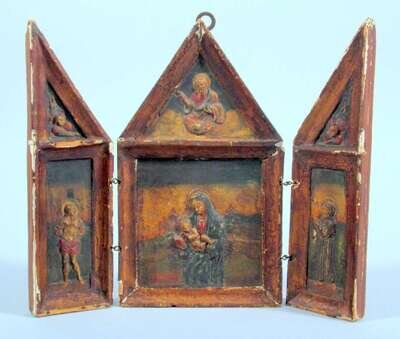 Modelled in relief, the central and side panels depict the Madonna and Child with Saints Sebastian and Francis.