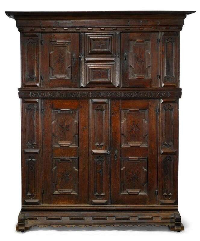 In two parts, the molded cornice over twin cupboard doors inlaid to show stars within mitre molded panels, the lower section with carved frieze reading 'Margrete Meyer Zubockel Anno 1729' above two cupboard doors similarly inlaid and within similar panelling, raised on carved base.
