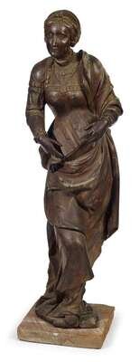 Depicted standing in flowing drapery, holding the book in her hands, wearing a necklace with star pendant around her neck, her hair in plaits, on later square base.
