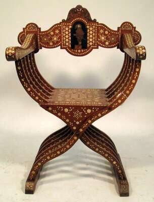 The back centered by an inlaid image of a cavalier, the legs, seat, and arms profusely inlaid to show stars, lozenges, and stars in the typical style.