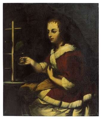Oil on tin, depicting a young girl holding a parakeet. Old inventory label and titled on verso, unframed.
