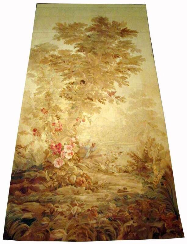 Depicting a landscape with trees, colorful birds, and flowers in earth tones.