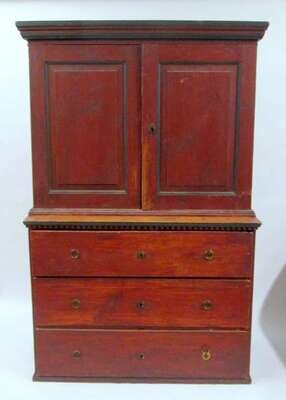 In two sections: the molded top over twin cupboard doors, the lower section with three long drawers.