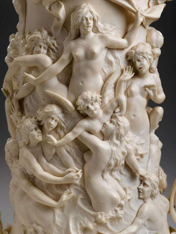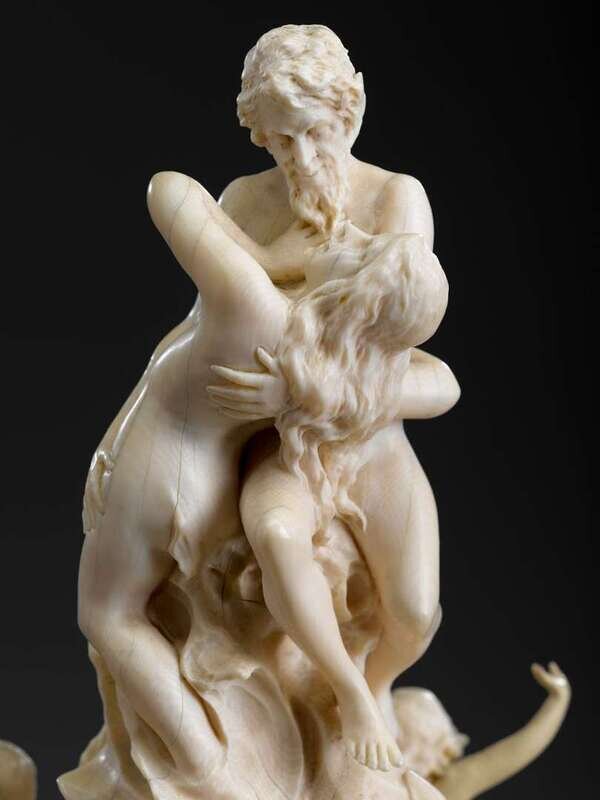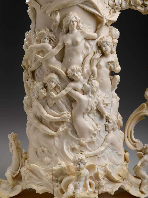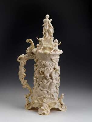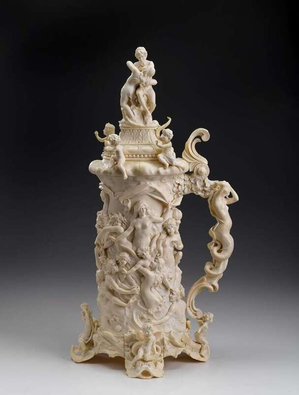 The hinged cover surmounted by an embracing Bacchus and Ariadne amongst waves on a leaf-tip base, with four putto figures surrounding, the cylindrical body carved to show horses, swans, sea-monsters and nude nereids emerging from a turbulent sea, the handle in the form of a mermaid above a C-scroll, the base with four feet in the form of putti on sea-monsters amongst rock-work and shells.