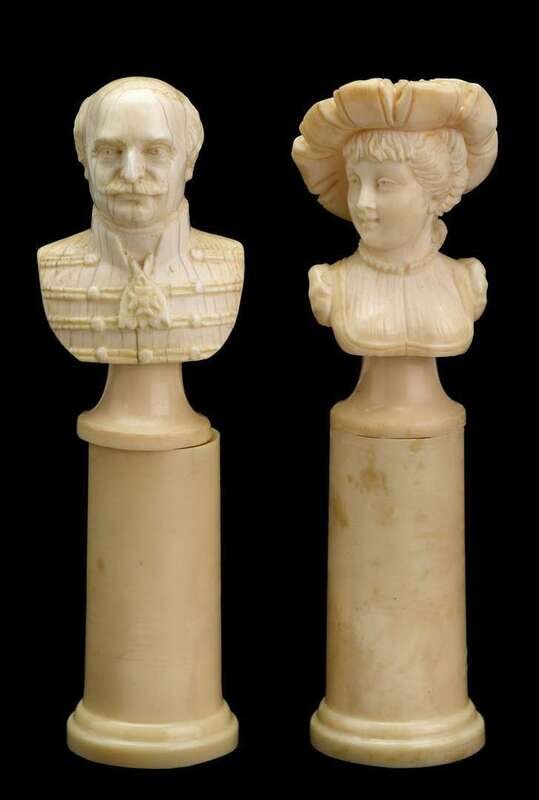One of a gentleman in military garb, the other of a lady in feathered hat.