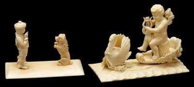 The first of a putto playing a lyre whilst riding a boat pulled by a swan, the other of a young boy teaching his dog a new trick.