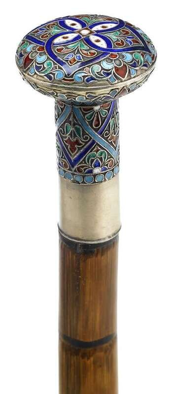 Russian walking stick with enameled silver handle and bamboo shaft spurious marks for ivan khlebnikov