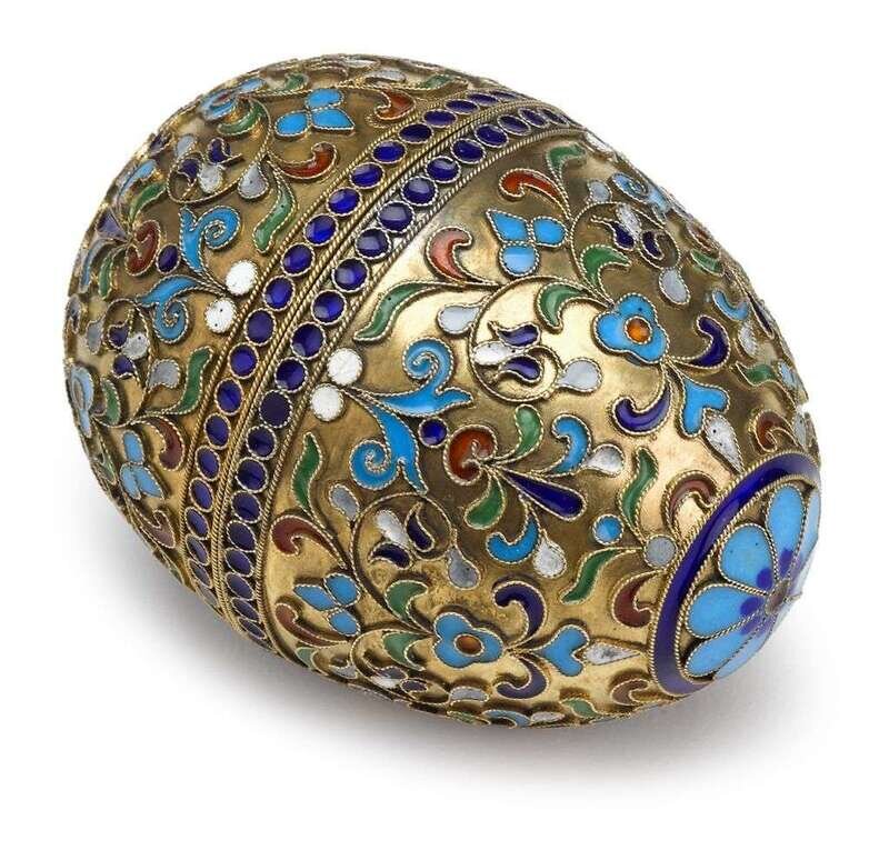 Russian cloisonne enameled silver-gilt egg-form box spurious marks for maria semenova