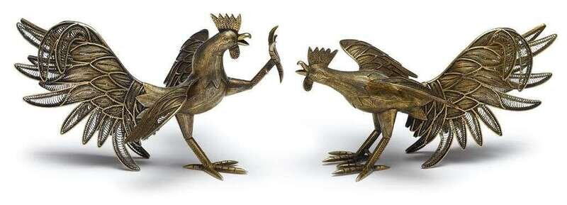 Pair of Russian silver-gilt filigree cockerels spurious marks for pavel ovchinnikov