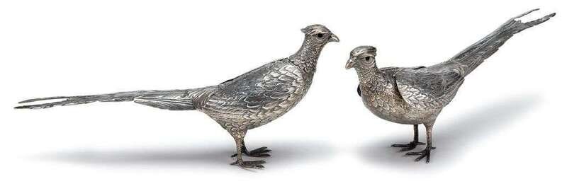 Naturalistically modelled with articulated wings, each having removable heads to reveal hollow bodies. Marked "Sterling."