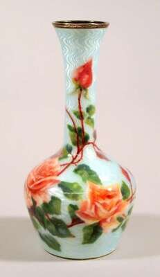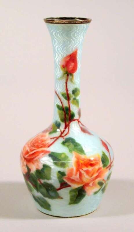 With bulbous body and tall cylindrical neck, painted with roses on a pale blue guilloche ground, 935 silver standard.