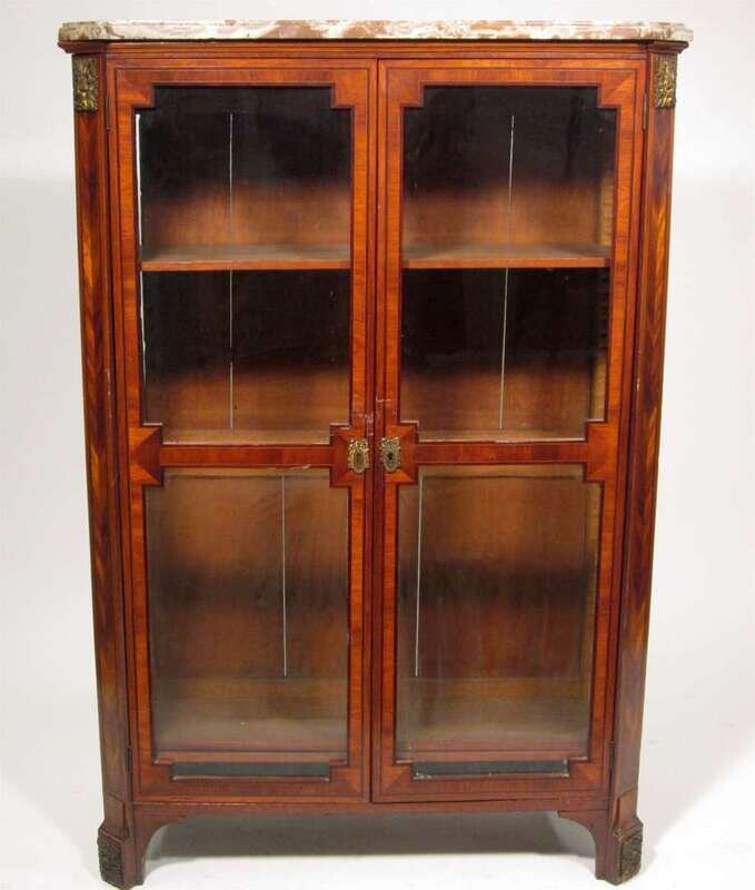 The marble top with square corners, above a conforming case fitted with twin glazed doors, above rosette capital black feet.