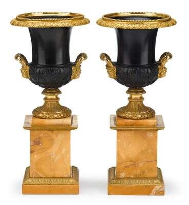 Pair of Continental gilt and patinated bronze urns early 20th century