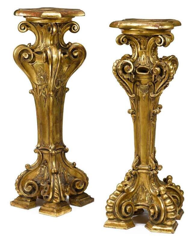 In the rococo manner, the shaped square top over conforming column with bold scrolls at the shoulder, scroll-form quadripartite base. Contemporary "Brizzolara & Fighli" labels to both tops.