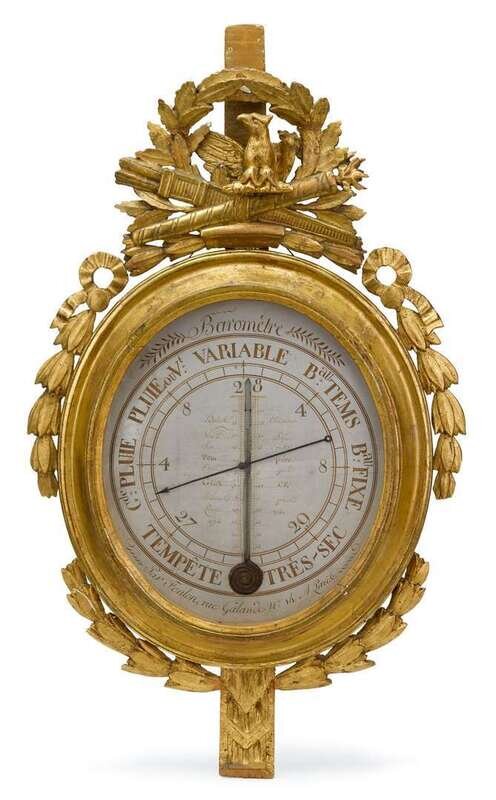 The circular painted dial with mercury thermometer, the case with applied laurel edges, surmounted by a trophy.