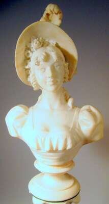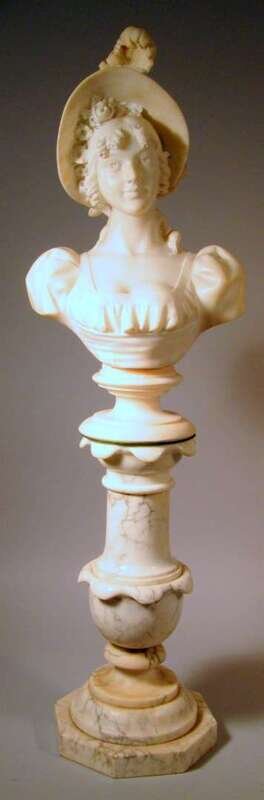 The young lady depicted wearing a large bonnet with feather, above circular socle, raised on marble pedestal.