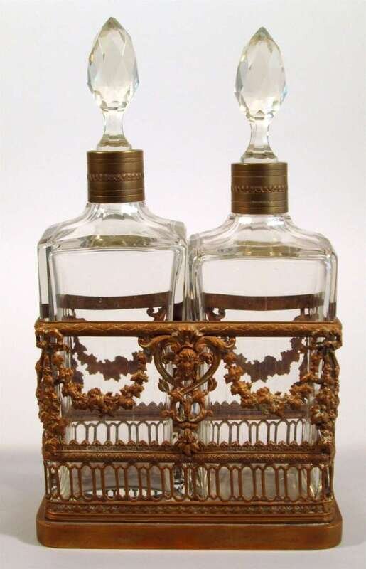 The reticulated bronze stand showing to either side a classical mask flanked by swags of grapevine leaves, fitted with a pair of stoppered glass bottles. Impressed "France" to the underside.