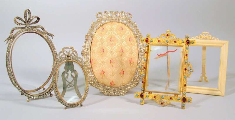 Including two rhinestone-studded frames, one of rectangular form in ivory, an openwork ribbon-tied floral white metal oval frame, and a glass and gem-set gilt metal frame.