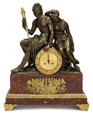 The circular gilt engine-turned dial surmounted by a female and male classical figure, the male holding a flaming torch, above a large rouge griotte marble base with trophy mount to the facing side, raised on leaf-cast feet.