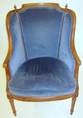 The carved crestrail into armrest raised on acanthus carved supports enclosing fabric upholstered back, over cane seat with fabric upholstered cushion, raised on cylindrical tapering fluted legs.