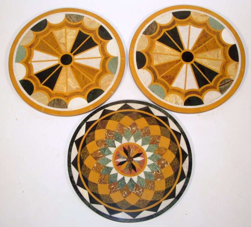Each of circular form, inlaid in varicolored marbles to show a radial geometric pattern.