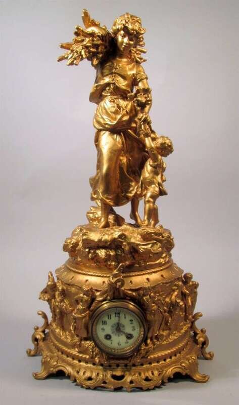 The circular dial with Arabic numeral hours within a gilt metal case worked to show farmers at work, surmounted by a figural grouping of a young woman carrying a bundle of sticks with a child walking beside her and handing her a bouquet of flowers.