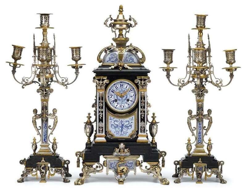 French porcelain inset slate and silvered brass clock garniture 19th century, the movement by japy freres