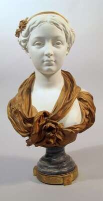 The young female figure dressed in gilt drapery and with a band of flowers in her hair, signed L. Gregoire to the reverse, raised on gray marble pedestal base.
