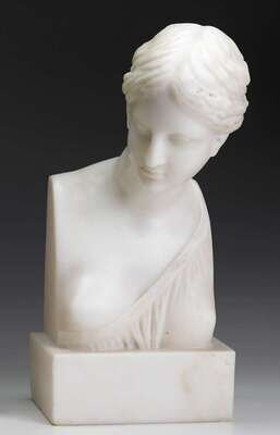 Carved to show a woman with a serene expression, her left breast exposed from her robe, raised on square plinth base.