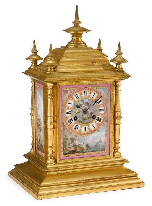 The circular dial with Arabic numerals, surrounding a scene of playful putti on a sea beast, above a scene of boats at sea and a castle at the shore, all with borders of raised dots, the back of the movement stamped A P, the side panels painted to show couples fishing in bucolic settings, turned columns with spire finials at corners, raised on stepped base.