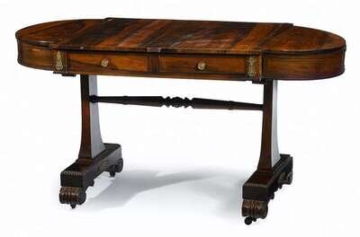 The rectangular top flanked by two D-shaped compartments opening to vacant interiors, above two frieze drawers flanked by anthemion mounts, raised on tapering supports united by turned stretcher, over pedestal and scroll carved feet terminating in castors.