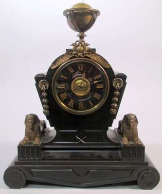 The circular dial with Roman numeral cast hours, within shaped black marble case surmounted by a globe and flanked by sphinxes, raised on scroll carved foot.