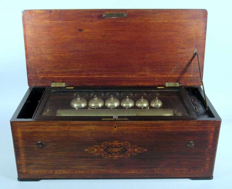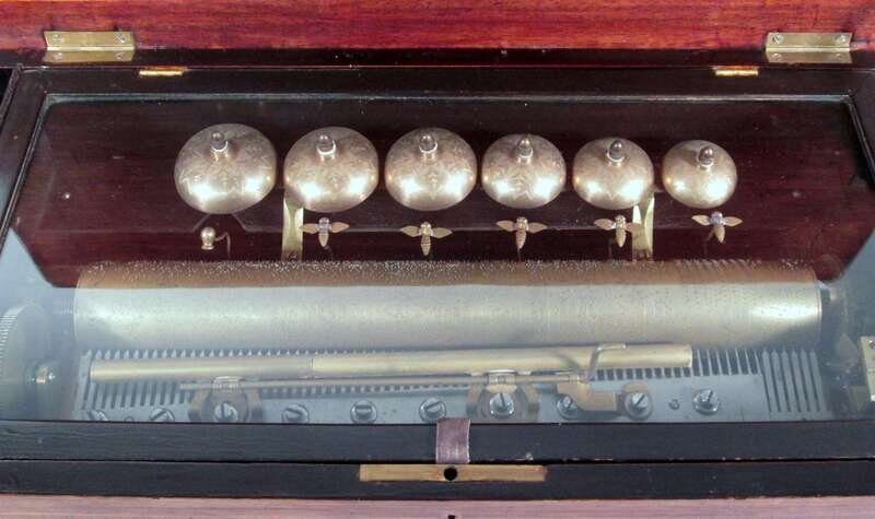 Rectangular, the hinged lid opening to a brass cylinder and six bells with bee-form hammers.