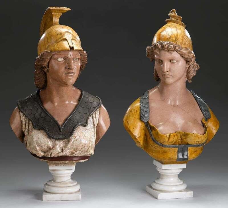 The gladiator bearing a stern expression and wearing a yellow marble helmet, gray marble collar and pink veined white marble tunic; the bust of Minerva depicted wearing a yellow cap surmounted by a coiling snake, with gray marble collar and yellow marble bodice, both raised on white marble socle bases.