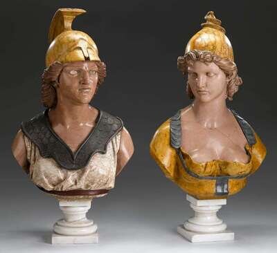 Pair of Italian varicolored marble busts of a gladiator and Minerva 19th/20th century