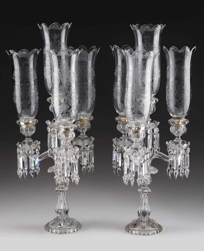 The vasiform standard raising a floriform bowl joined by three arms terminating in bobeches hung with prisms, each supporting an etched glass hurricane shade, acid stamped under the foot.