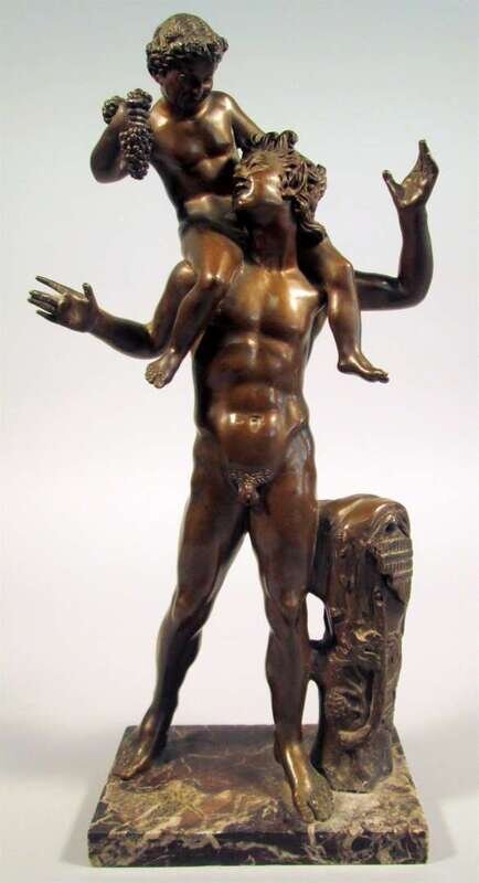 Mid-brown patina, cast to show Silenus dancing as he holds Bacchus upon his shoulders, raised on square marble base.