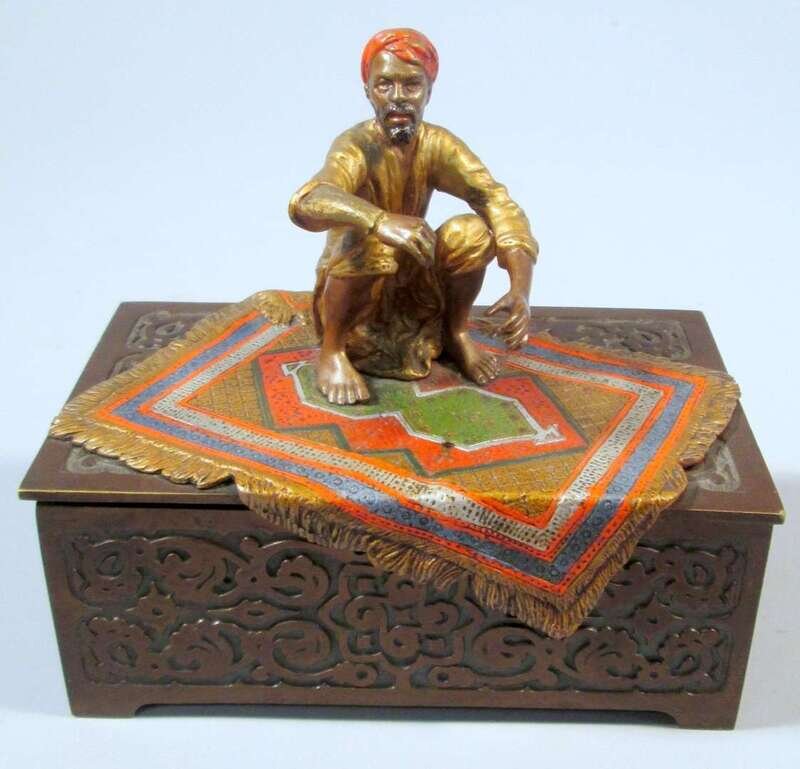 The hinged lid mounted with cast figure of a man squatting on an oriental rug, the interior with wood liner.