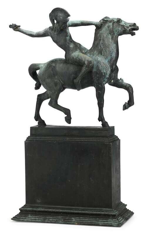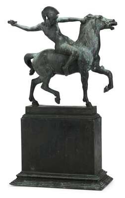 Bronze, weathered verdegris patina, depicting an Amazon warrior about to launch a spear as she rides a horse bareback, holding on only by the horse's mane, raised on pedestal base. Signed "Franz von Stuck" and with foundry inscription " Guss C Leyre, Munchen".