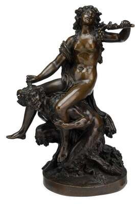 Bronze, brown patina, cast to show a near nude maenad mounting a satyr's shoulders, raised on circular plinth base. Signed 'Clodion'.