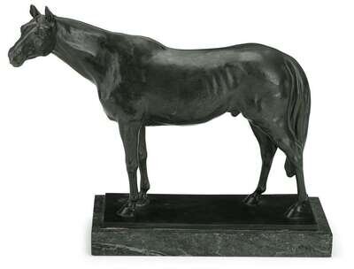 Bronze, greenish dark brown patina, cast to show the standing horse on plinth base impressed 'F. LUGERTH' and 'Birks', raised on green marble plinth.