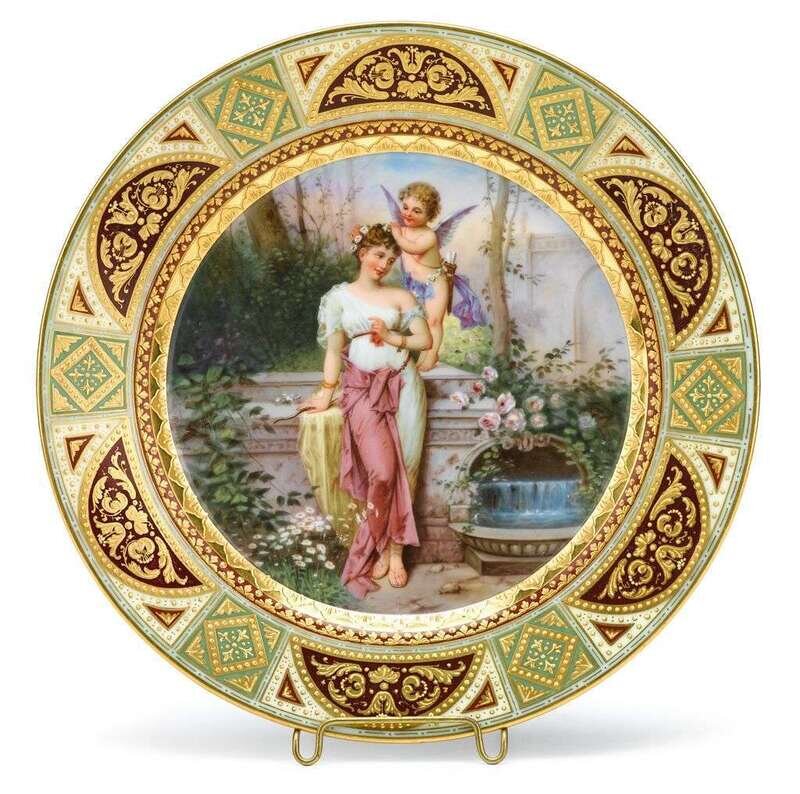 Circular form depicting Venus and Cupid in an idyllic landscape, the border with raised gilt foliate detail on deep red, green, and cream grounds, signed Richter lower left, titled "Nymphe und Amor" to the underside, also with blue beehive overglaze mark, gold flower, and the numbers 02638 in red.