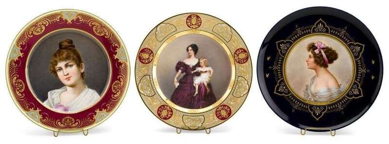 One centrally painted with a beauty signed "C. Forster", within a puce and lemon ground border gilt decorated to show lattice, scrolls and dots, titled "Girofle" and with underglaze blue beehive mark to underside; the other painted with a portrait of Countess Gower and her daughter, within an intricately gilt decorated border on pink, green, red, and blue grounds, titled "Countess Gower & Child", blue underglaze beehive mark and iron red 646 to underside; the last painted to show a beauty signed "J.Dahn, 8B", within a gilt decorated cobalt blue border, buff underside with beehive mark and impressed ?PLM. (3).